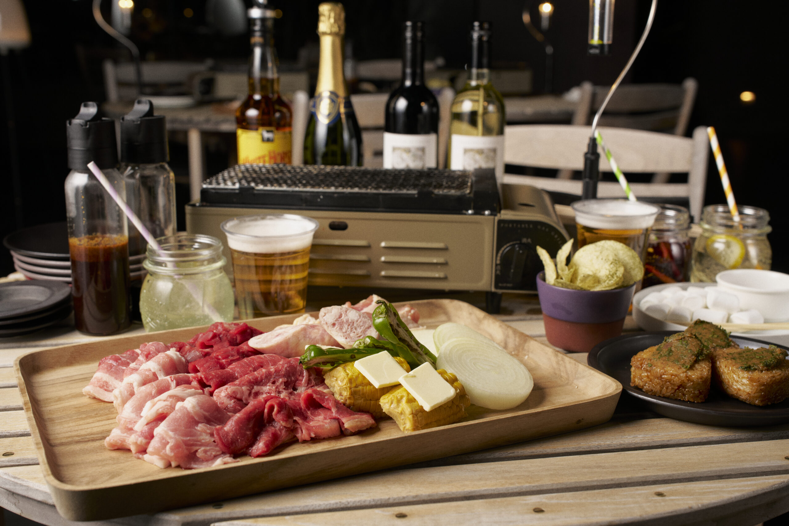 糸島豚や糸島ソーセージ、はかた地鶏など地元素材のBBQと、生ビール、スパークリングワイン、カクテル各種のフリードリンクがセットになったお得なプランを開放的な最上階テラスにてお楽しみいただけます。