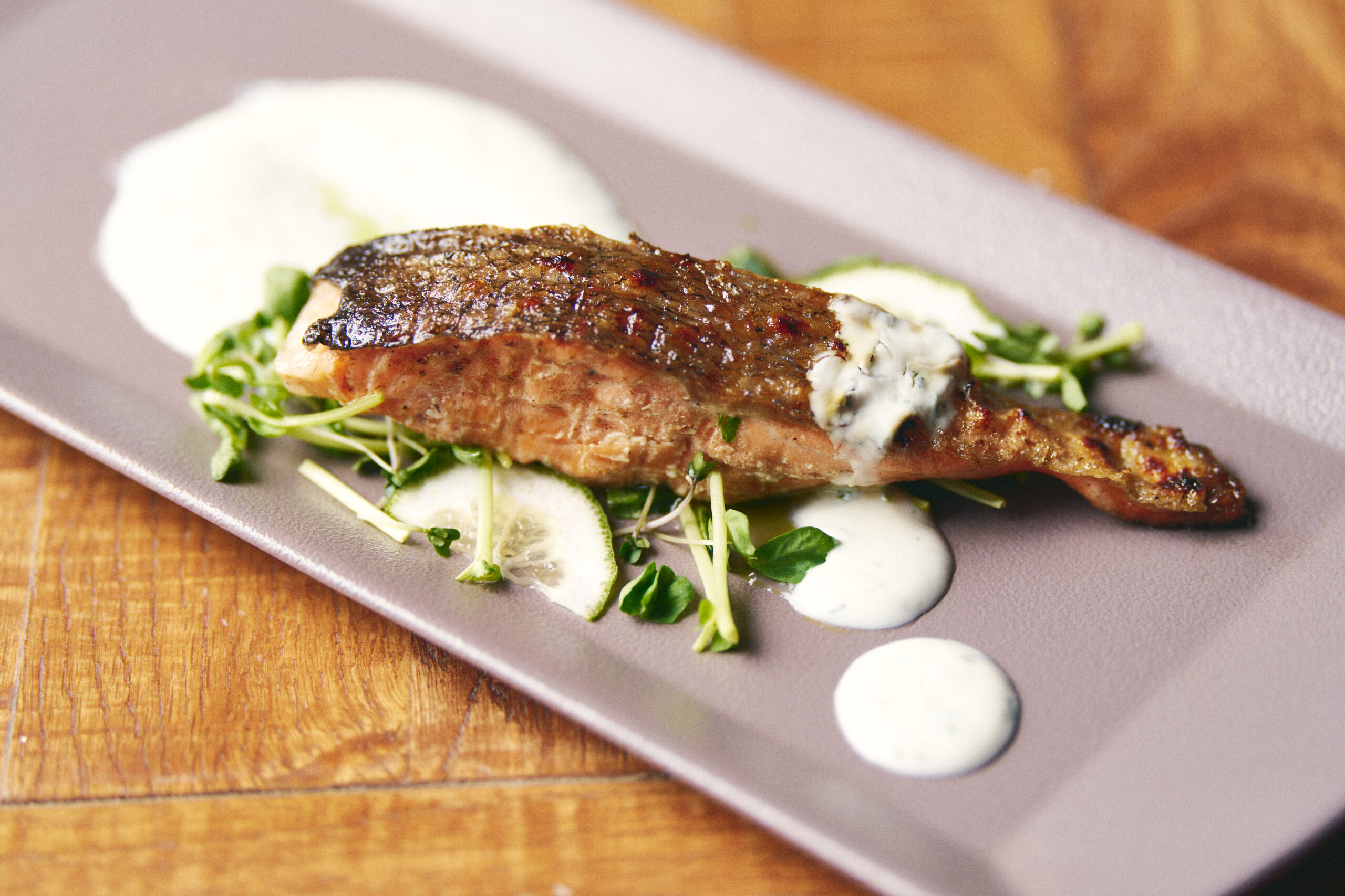 ・サーモンの熾火焼き フェンネルヨーグルトソース