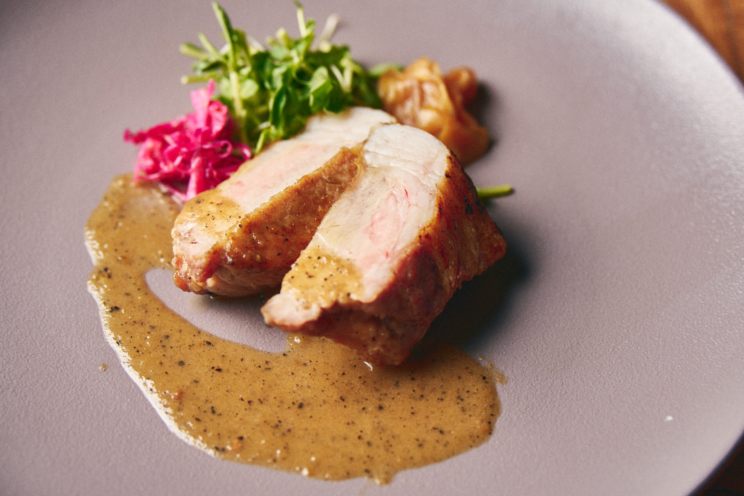 ・糸島ポークの熾火焼き 発酵焼き林檎のソース